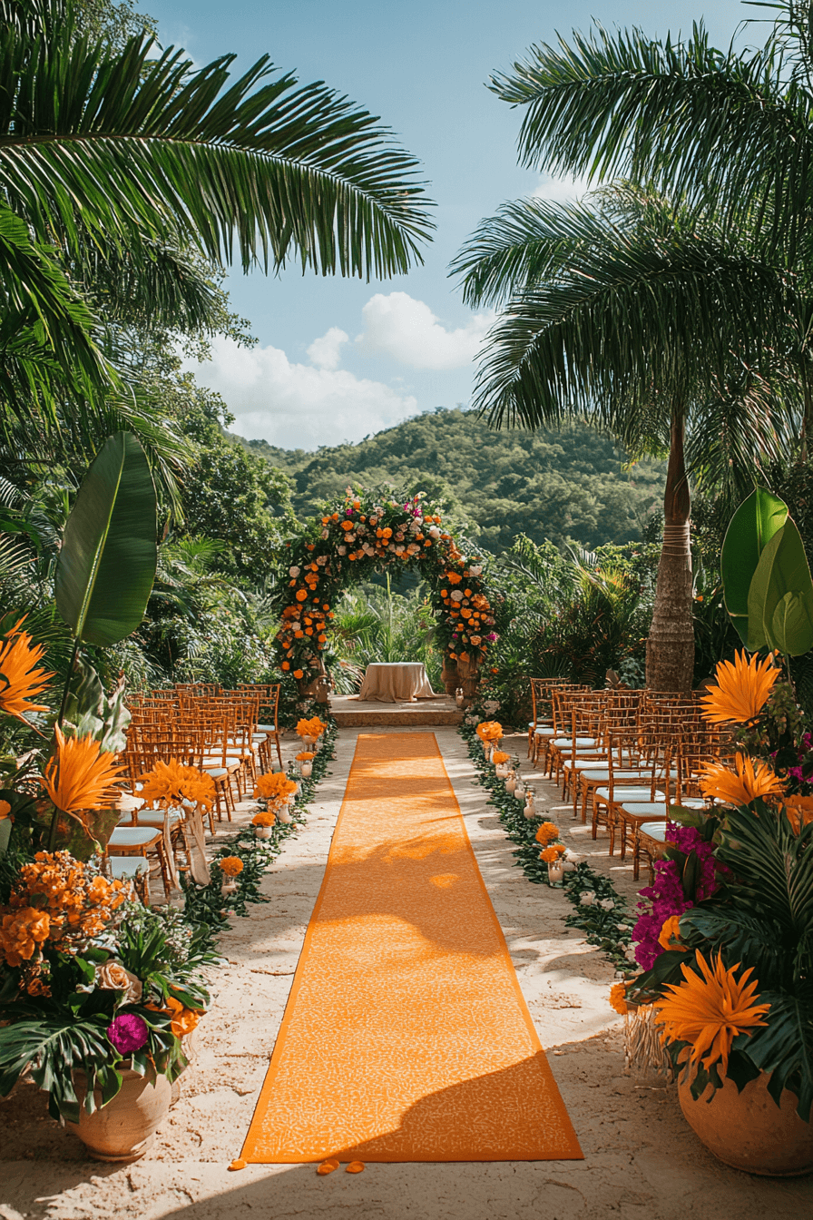 Lush greenery and bold florals bring energy into small wedding ideas with a tropical feel. Bright colors and natural textures create a vibrant, vacation-like atmosphere. Light fabrics keep the space breezy and relaxed. The setting feels joyful and full of life. Every detail adds a sense of escape. Bring tropical vibes to your special day.