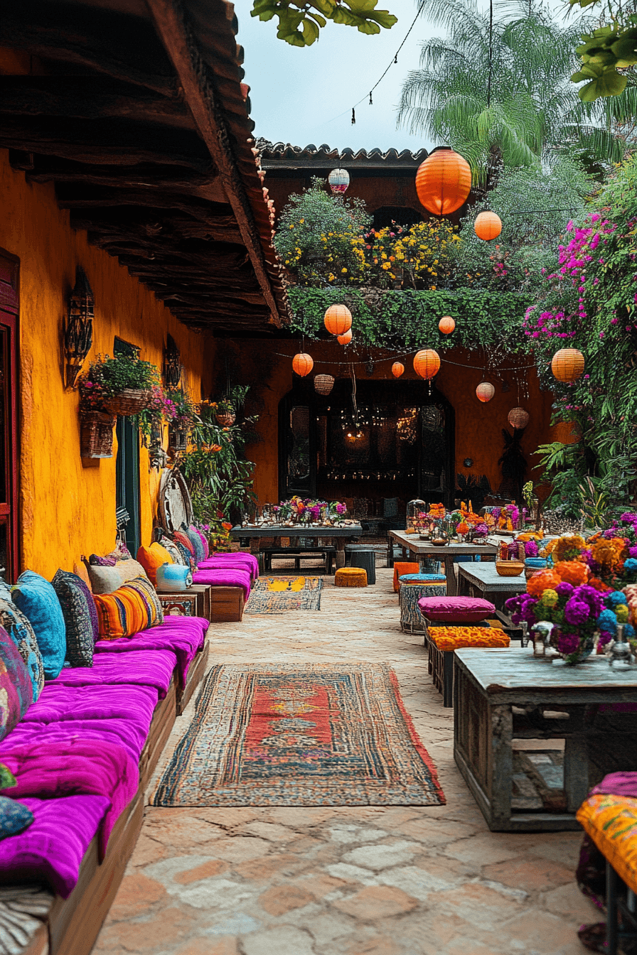 A vibrant courtyard instantly energizes small wedding ideas with bold colors and lively decor. Bright textiles and eclectic seating create a warm, welcoming space for guests to gather. Open-air layouts keep the atmosphere relaxed and social. As the sun sets, lanterns and lights elevate the mood beautifully. It’s a celebration full of personality and joy. See how to recreate this colorful setting.