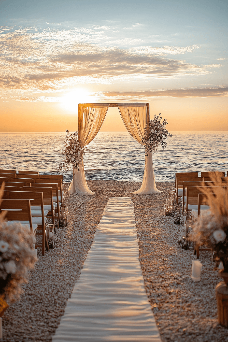 Ocean views and soft sand transform small wedding ideas into a serene coastal celebration. Minimal decor allows the natural beauty to shine effortlessly. Light fabrics and subtle florals enhance the relaxed elegance. The sound of waves adds a peaceful, romantic touch. Every detail feels calm and timeless. Get inspired by this beachside style.