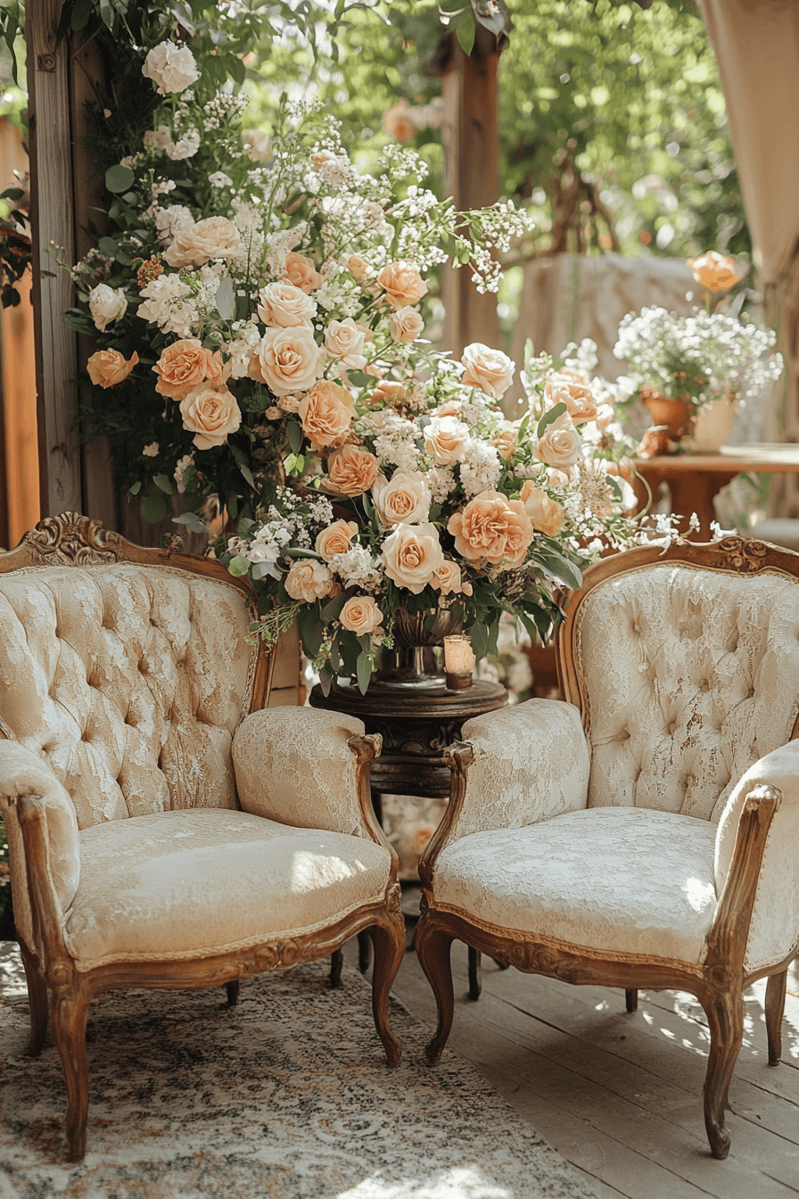 Classic details bring timeless elegance into small wedding ideas with a vintage touch. Lace accents and antique decor create a romantic, nostalgic atmosphere. Soft florals enhance the delicate, old-world feel. Mixing heirloom pieces adds meaning and depth to the design. The result feels warm and beautifully personal. Add vintage charm to your day.