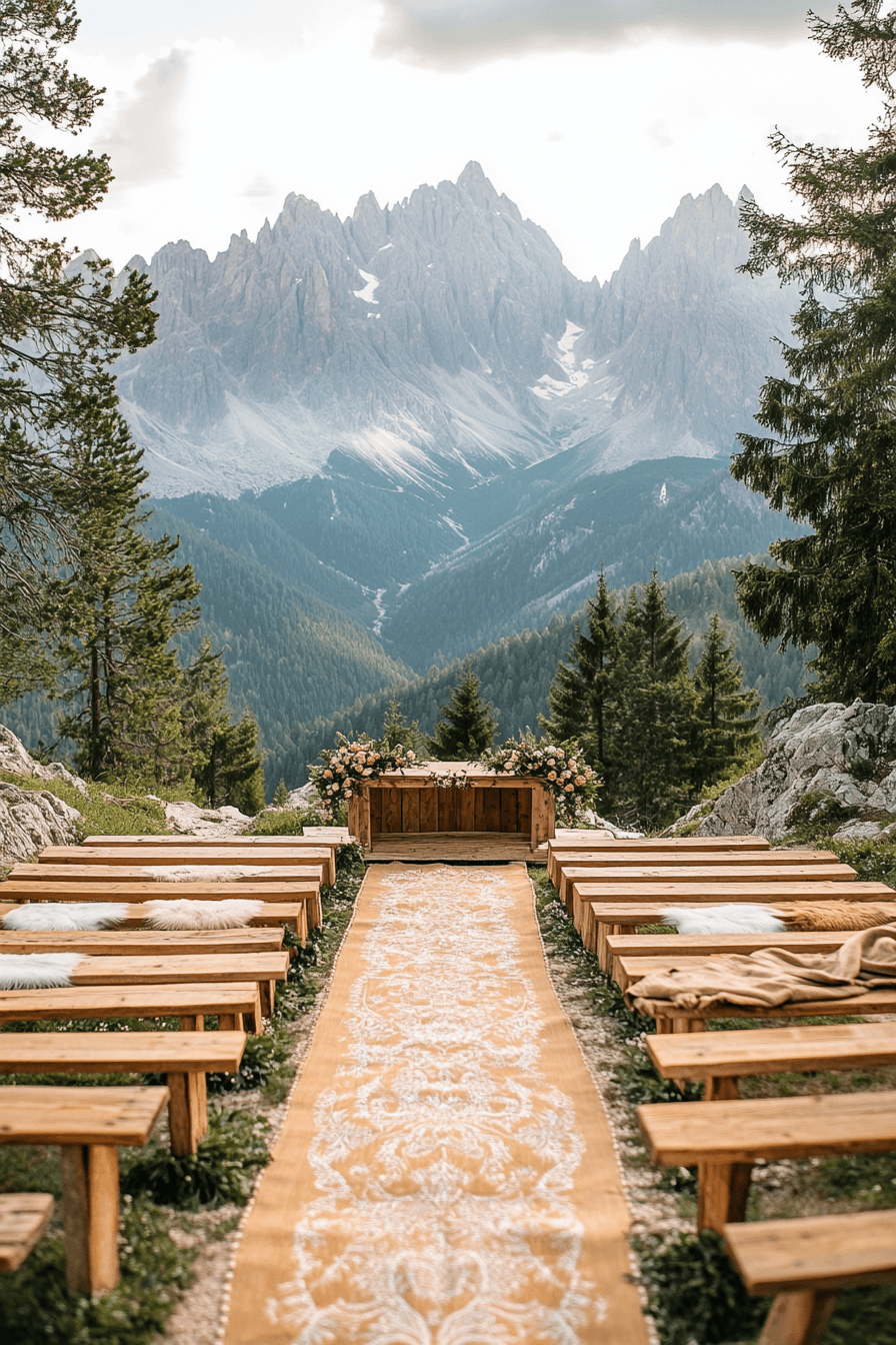 Breathtaking views turn small wedding ideas into a peaceful, nature-filled experience. Minimal decor lets the landscape shine as the main feature. Wooden accents add warmth and balance to the setting. Soft lighting enhances the romantic feel as the day fades. The atmosphere feels intimate and unforgettable. Capture the beauty of a mountain setting.