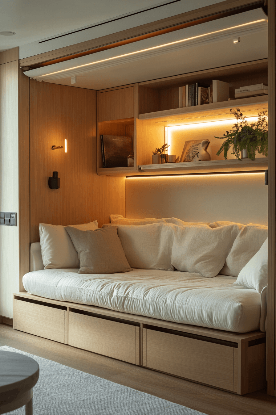 Organization can make your space feel calm and efficient. A clutter-free sofa bed living room uses hidden storage and multi-use furniture to maintain order. Clean finishes enhance the modern aesthetic. Every item has its place. The room feels polished and easy to maintain. Bring order and style into your home.