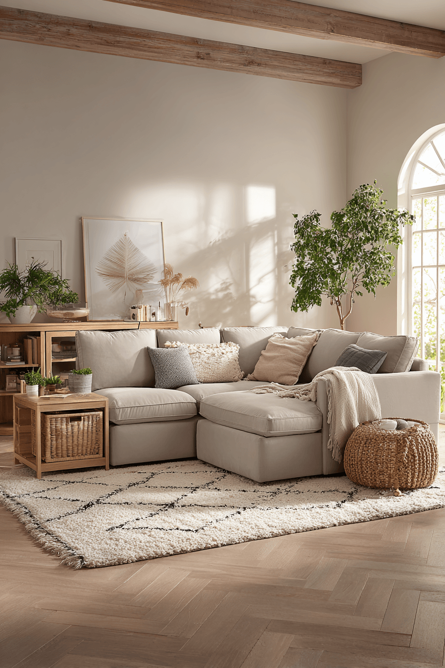 Warm details can turn a simple space into something special. A cozy sofa bed living room styled with soft lighting, layered fabrics, and textured decor feels instantly inviting. A plush rug anchors the space while adding comfort. Storage baskets keep everything organized and accessible. The overall vibe feels relaxed and welcoming. Design a space that feels like home.