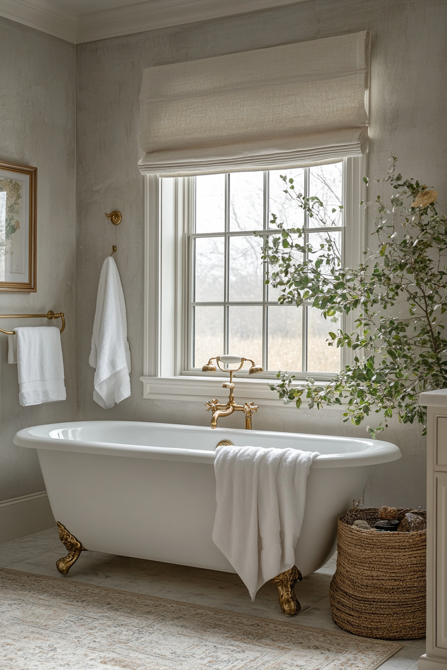 This stylish small bathroom beautifully blends vintage charm with modern design. The freestanding tub is a classic element, embodying a timeless appeal. It’s complemented by sleek brass fixtures that add a touch of sophistication.