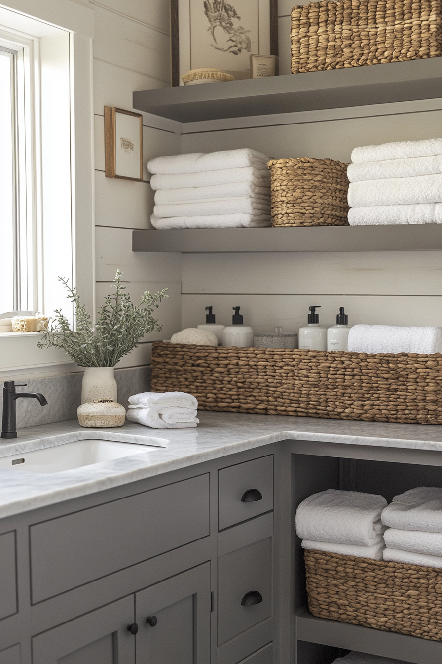 Storage in a small bathroom can be a challenge, but this image shows how to do it with style. The combination of open shelves and closed storage creates a balanced look. The grey cabinetry under the sink offers plenty of space for towels and toiletries.