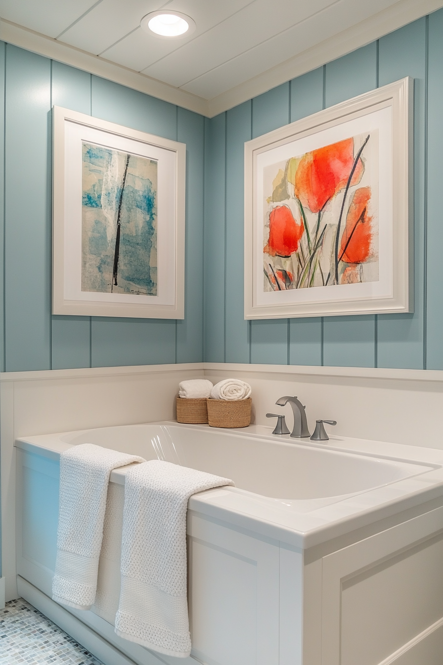 Adding such artistic elements is one of the stylish small bathroom ideas that can elevate your space. Instead of plain tiles or bland walls, think about how artwork can reflect your personality and make the room enjoyable.