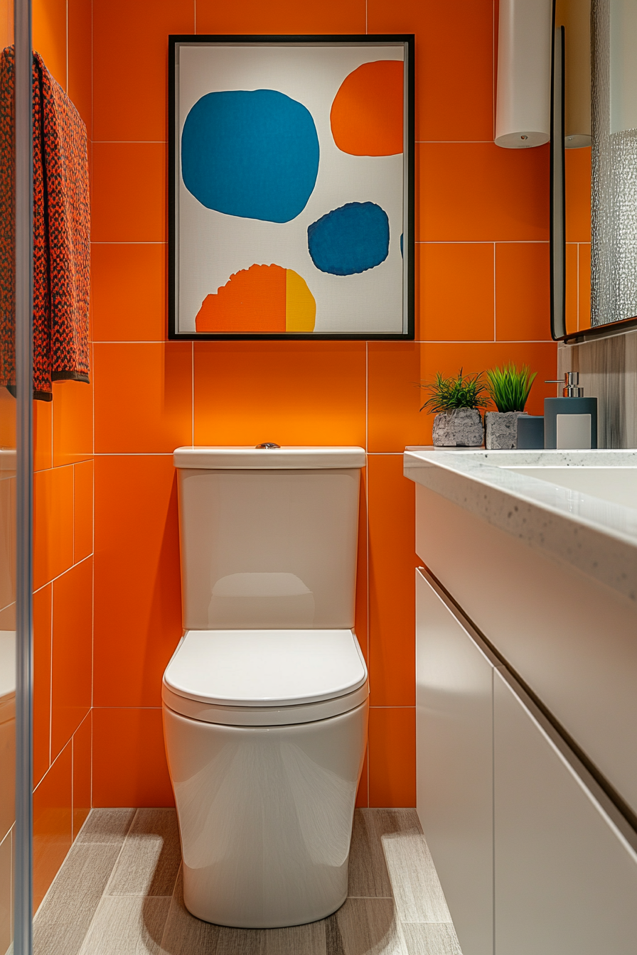 This small bathroom bursts with color and personality. The bright orange cabinet and toilet create a fun focal point. It’s not just about functionality; it’s a stylish space that reflects a cheerful vibe.