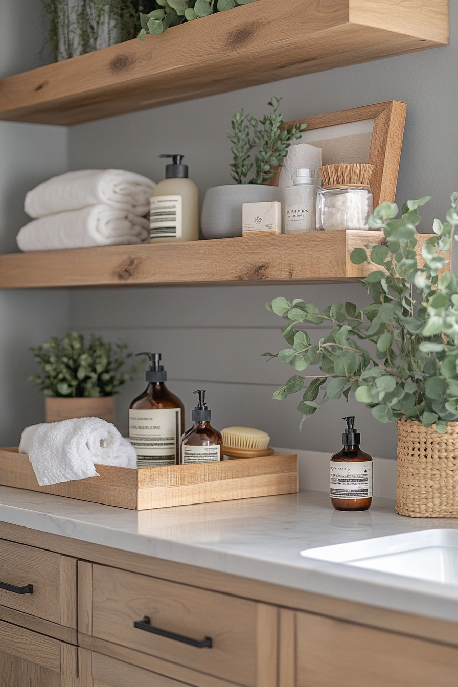 Floating shelves add a modern touch to any bathroom. In this image, you can see how they create a clean and airy feel. The shelves showcase a lovely mix of plants and decorative items, making the space inviting. The use of light wood contrasts beautifully with the neutral tones of the walls. This combination enhances the overall look and helps the items on the shelves stand out.