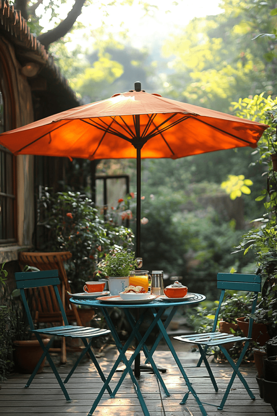 Cheerful design turns a tiny apartment patio ideas layout into a bright breakfast nook perfect for starting the day. A compact table with simple seating keeps things practical and open. Colorful plants or flowers add vibrancy and life. Light shade elements soften the sunlight while maintaining brightness. The atmosphere feels fresh and energizing. Create a patio space that makes mornings feel better.