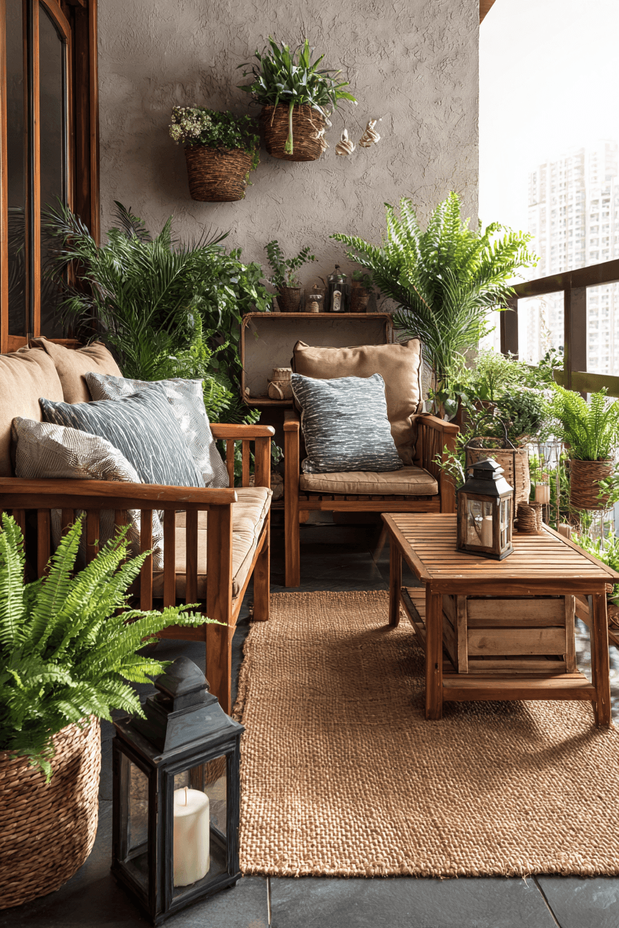Nature-inspired elements bring a grounded feel to a tiny apartment patio ideas setup filled with woodland charm. Rustic textures and greenery create a calming outdoor environment. Soft lighting enhances the cozy atmosphere in the evening. Natural details make the space feel peaceful and connected. The patio becomes a quiet escape from daily noise. Bring woodland calm into your outdoor space.