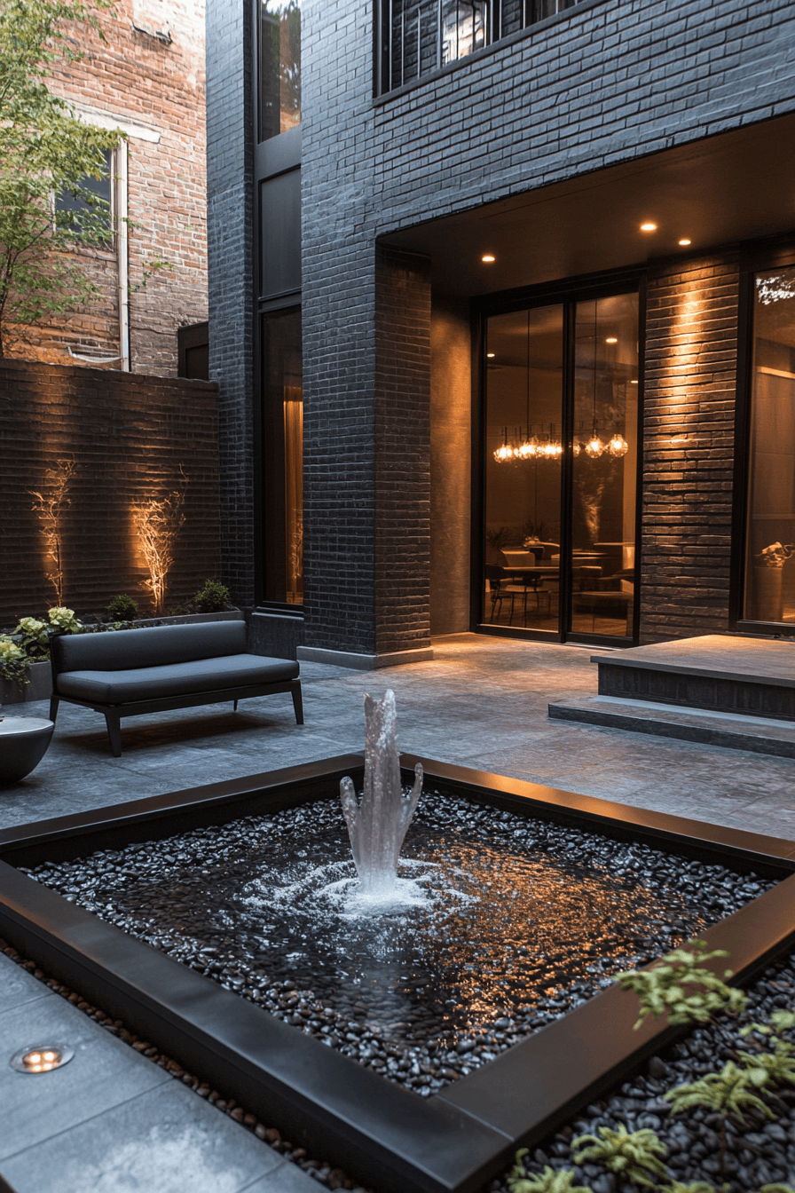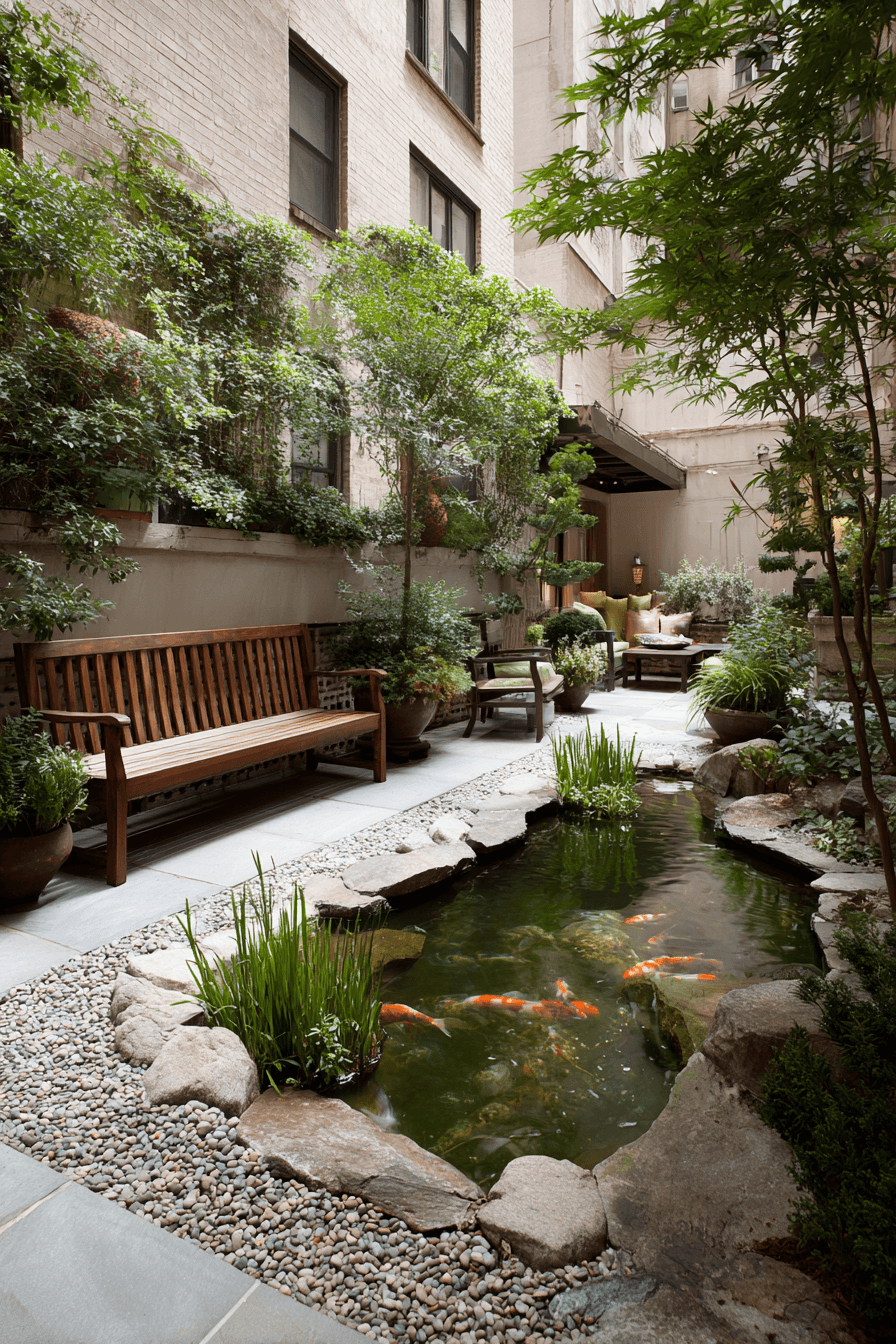 Water-inspired accents introduce calm energy into a tiny apartment patio ideas layout with a small decorative feature. A compact basin with stones and plants creates a peaceful focal point. Gentle movement enhances relaxation. The space feels balanced and refined. Small details make a big difference. Add calming water elements to elevate your patio.
