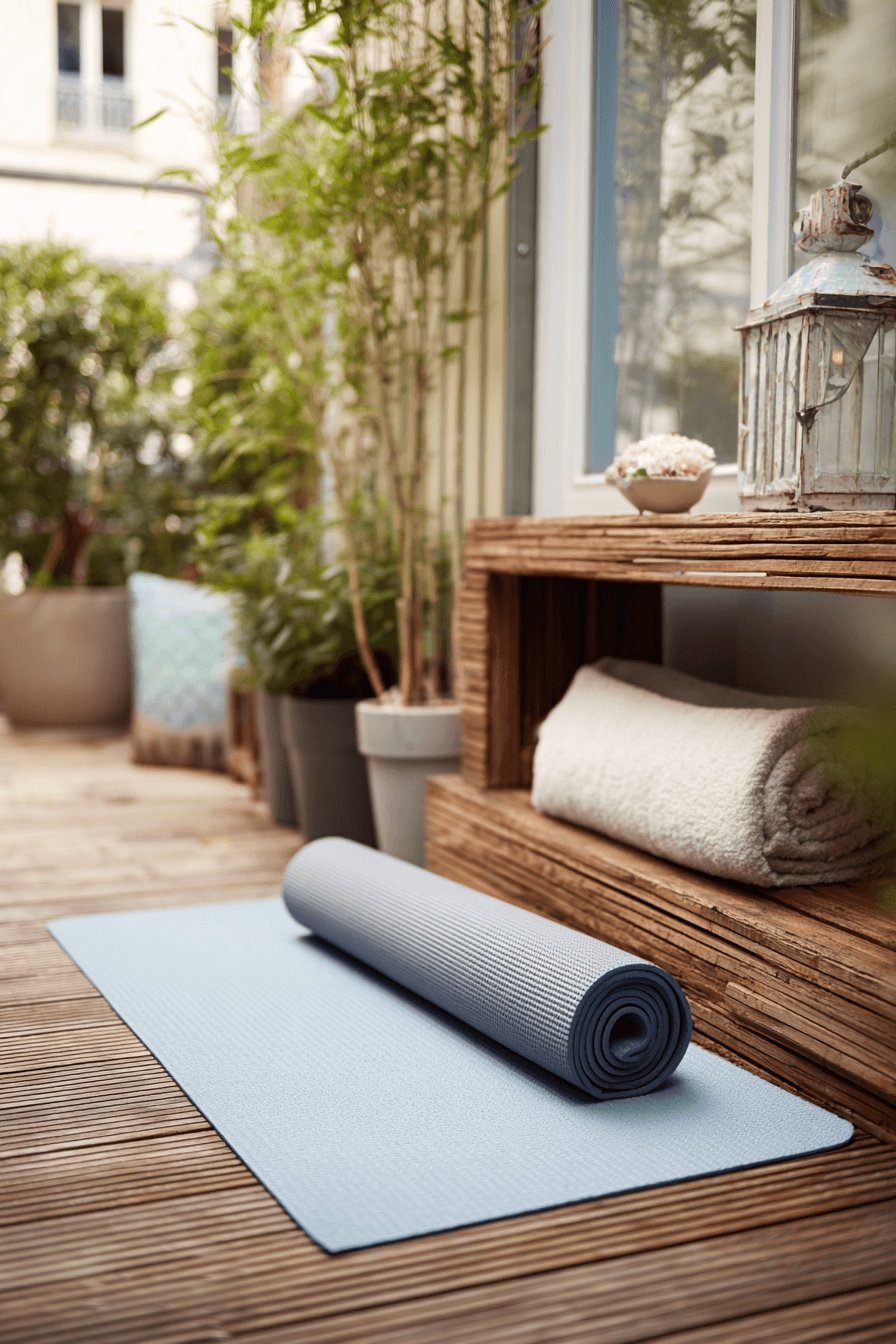 Mindful design turns a tiny apartment patio ideas setup into a calming yoga and wellness space. Soft surfaces and open layouts create a peaceful environment. Minimal distractions allow for focus and relaxation. A mirror enhances openness and light. The space supports movement and mindfulness. Design a patio that helps you reset and recharge.