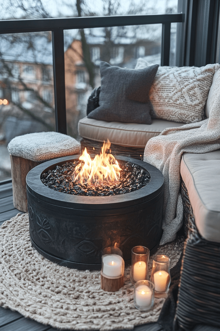 Warm ambiance transforms a tiny apartment patio ideas space with a compact fire feature that adds comfort and glow. Soft seating arranged around it creates an inviting setup. The flicker of light enhances the mood at night. The patio feels cozy and relaxing. Even small spaces can feel magical. Add warmth to your patio with fire-inspired design.