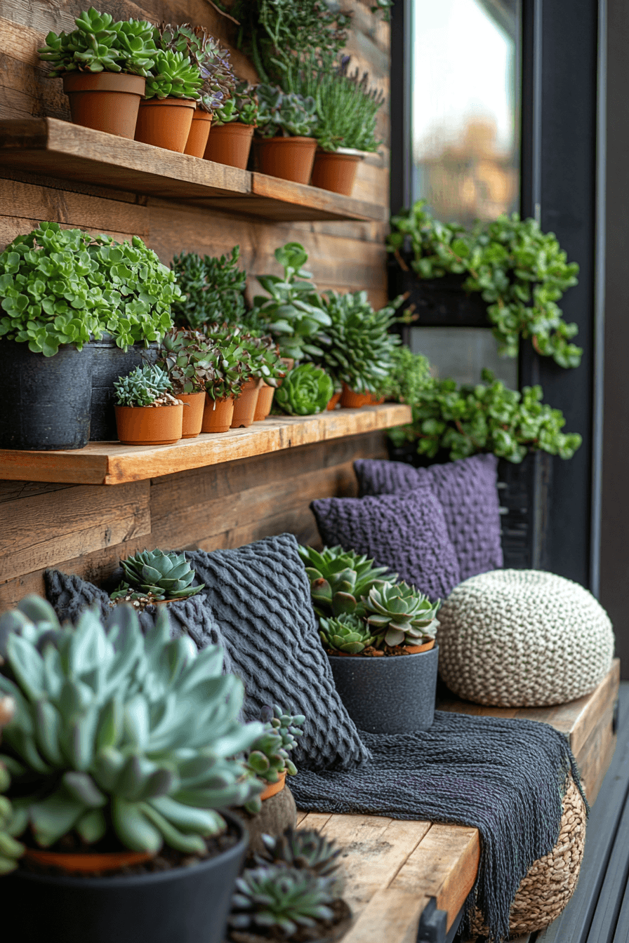 Low-maintenance plants bring effortless style into a tiny apartment patio ideas design with succulent arrangements. A mix of shapes and colors adds visual interest. Minimal care keeps things simple and stress-free. Thoughtful placement enhances the overall look. The space feels fresh and modern. Style your patio with plants that thrive easily.