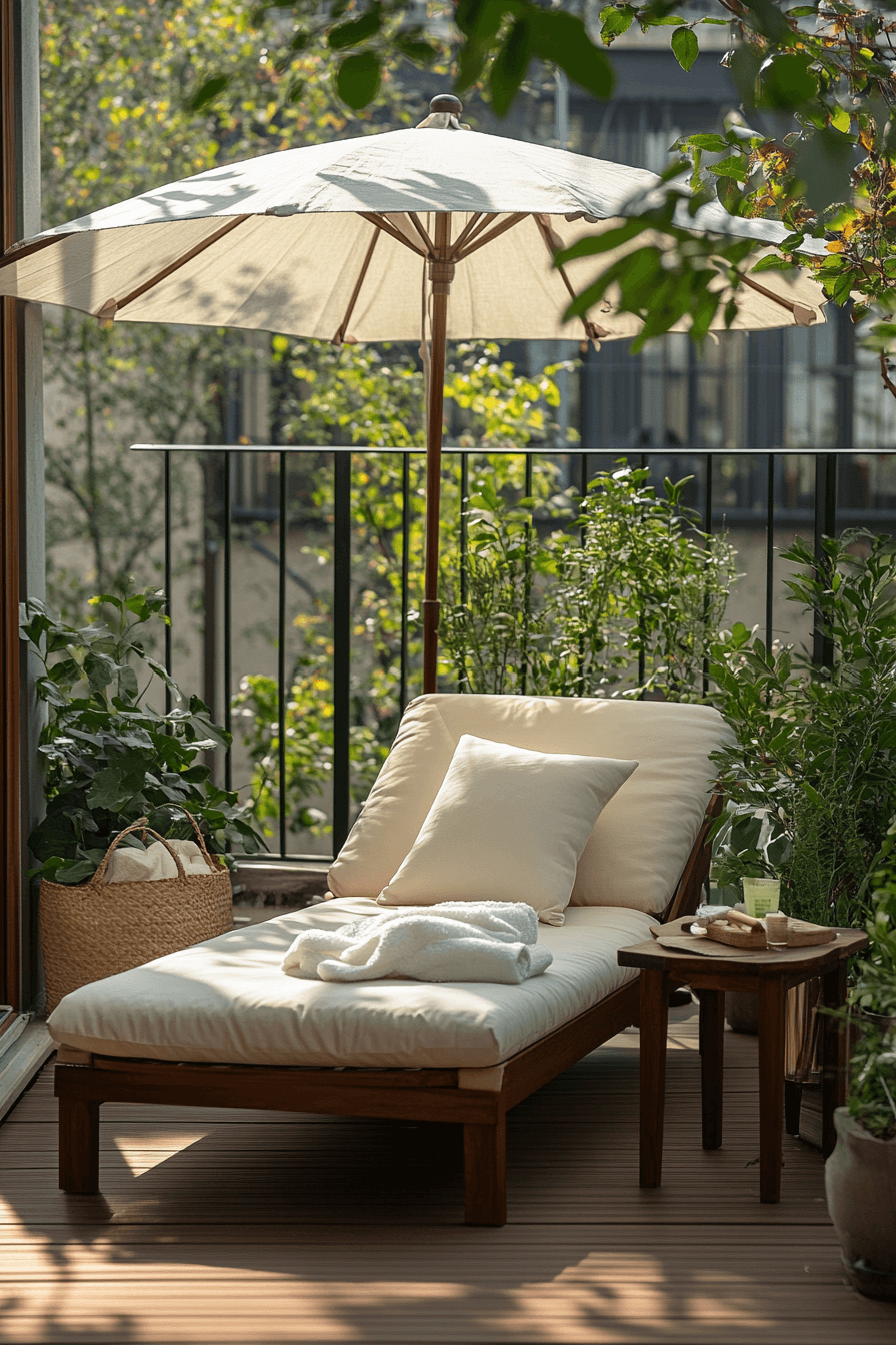 Sun-loving design creates a relaxing tiny apartment patio ideas setup perfect for lounging outdoors. A slim chair or lounger paired with a side table keeps the layout functional. Soft fabrics and shade elements keep the space comfortable. The patio feels like a personal escape. Perfect for enjoying sunshine and fresh air. Turn your patio into a relaxing outdoor lounge.