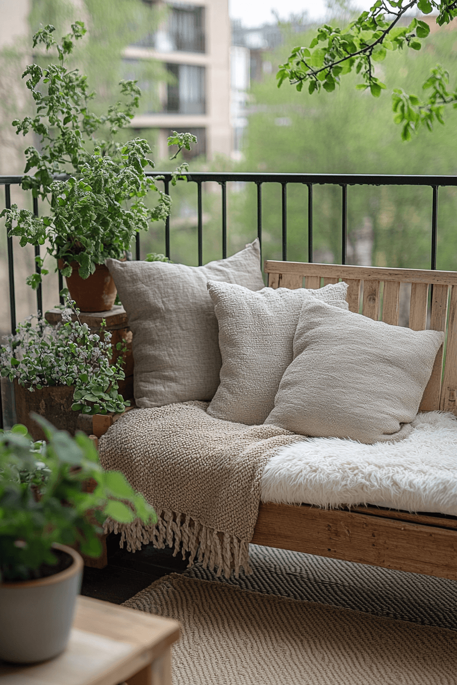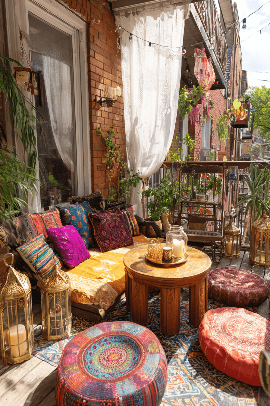 Relaxed boho energy fills a tiny apartment patio ideas setup with warmth, texture, and personality. Layered textiles, cozy cushions, and soft lighting create an inviting atmosphere. Hanging plants and mixed patterns add playful character without overwhelming the space. The overall look feels artistic and full of life. Perfect for unwinding or enjoying slow moments outdoors. Add a bohemian twist to your patio and let your style shine.