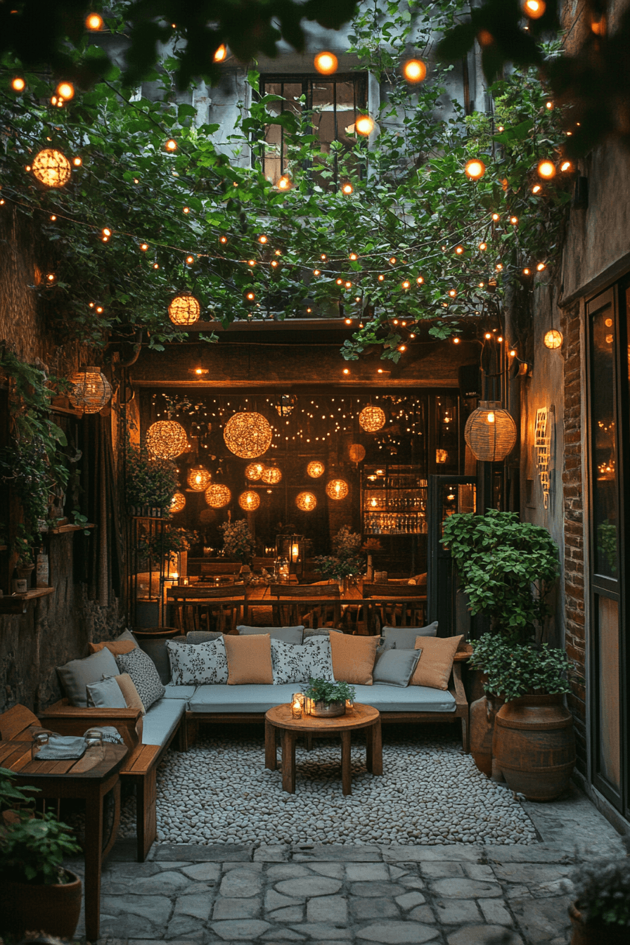 Layered lighting transforms a tiny apartment patio ideas layout into a cozy and inviting evening retreat. String lights and lanterns create a warm glow. Strategic placement enhances the overall atmosphere. The space feels relaxing and comfortable at night. Lighting adds both function and style. Set the mood with patio lighting that feels magical.