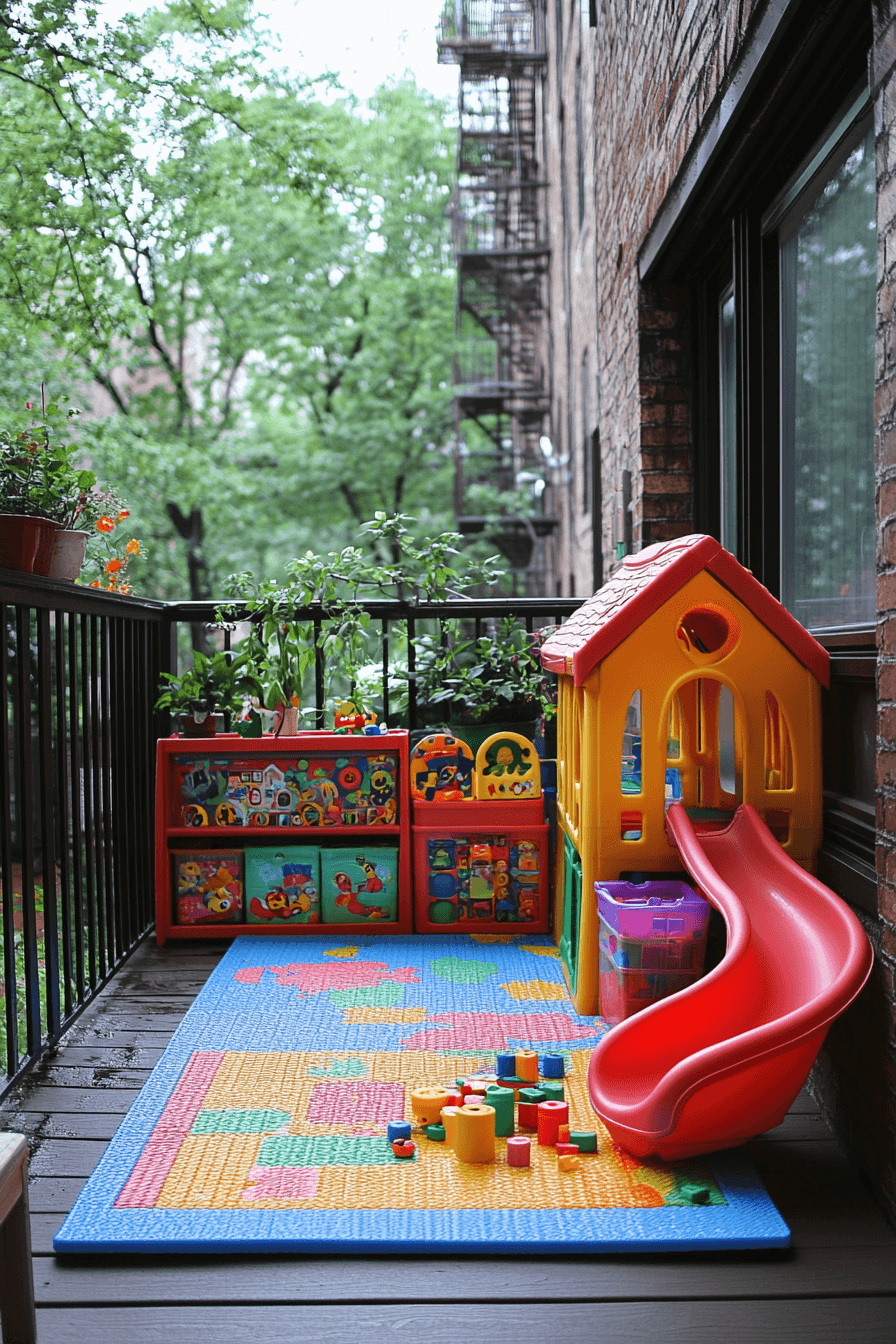 Playful touches bring life to a tiny apartment patio ideas design that’s perfect for kids and creativity. Compact play features and colorful accents make the space engaging. Smart storage keeps everything tidy. The patio feels fun and interactive. Ideal for encouraging imagination outdoors. Create a patio space that sparks joy and creativity.