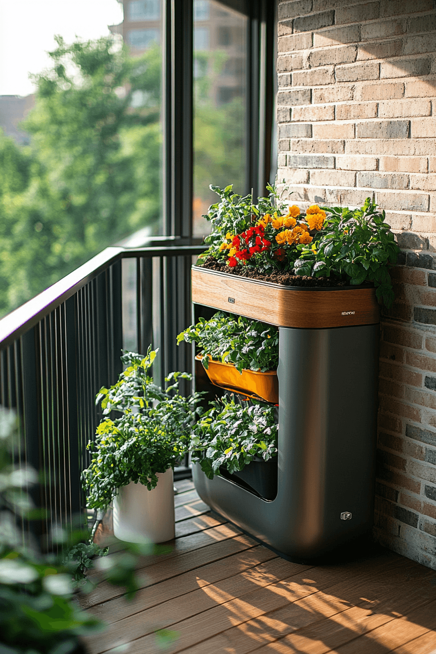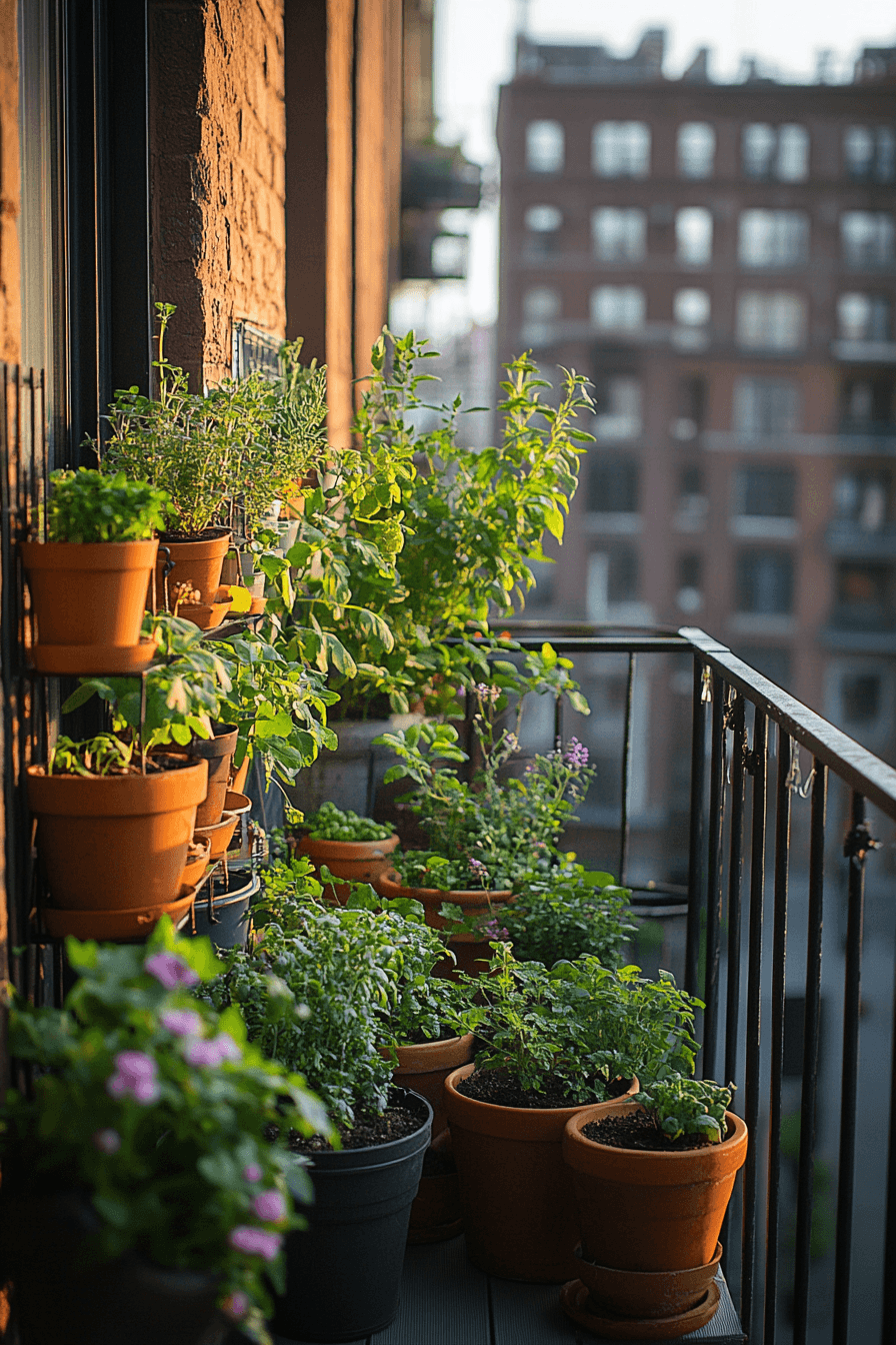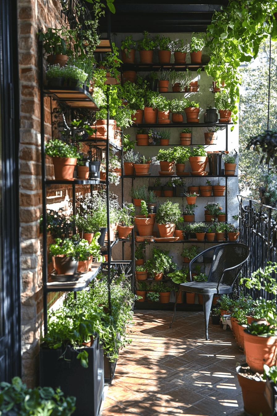 Fresh greenery meets functionality in a tiny apartment patio ideas layout that features a compact herb garden. Vertical racks and wall planters keep everything neat and space-efficient. Each plant adds color and purpose, perfect for cooking or decor. Organized pots create a visually pleasing display. The space feels lively and practical. Grow your own herbs and bring fresh flavor to your patio.