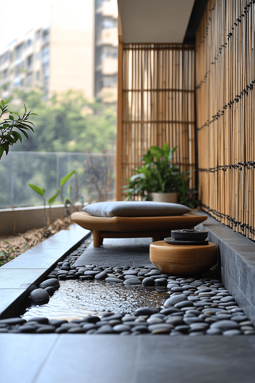 Tranquil design transforms a tiny apartment patio ideas concept into a peaceful Zen-inspired escape. Minimal furnishings and soft tones create a clutter-free, calming environment. Natural textures like bamboo and stone add warmth while maintaining balance. Subtle features enhance the relaxing mood without distraction. The space encourages stillness and clarity. Build a patio that feels like your own quiet sanctuary.