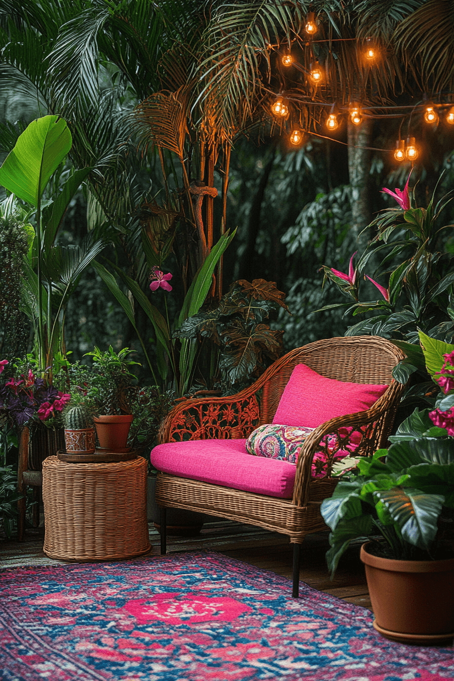 Vibrant greenery and relaxed textures give a tiny apartment patio ideas design a tropical, getaway-inspired feel. Woven furniture and layered plants bring warmth and energy to the space. Compact planters maximize greenery without limiting movement. Bright accents add a cheerful, carefree touch. The atmosphere feels uplifting and refreshing. Turn your patio into a lively escape that feels like a vacation.