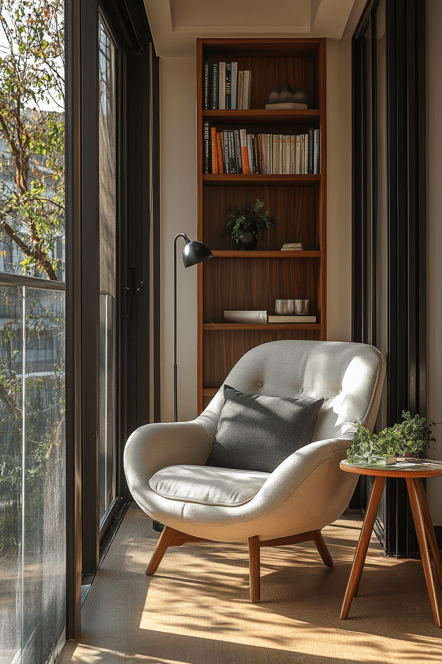 Comfort takes the spotlight in a tiny apartment patio ideas setup designed as a cozy reading retreat. A supportive chair with a nearby table creates a perfect place to unwind. Soft fabrics add warmth and make the space more inviting. Organized storage keeps books within easy reach. The environment feels peaceful and personal. Design a reading corner that turns quiet moments into something special.