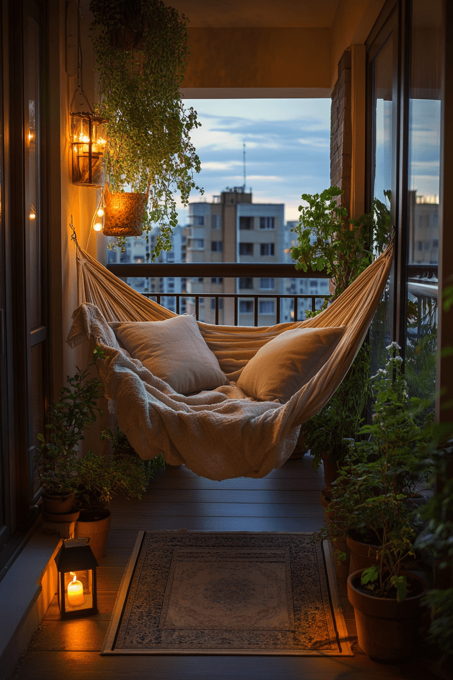 Laid-back comfort defines a tiny apartment patio ideas setup centered around a hammock-inspired retreat. A small hammock paired with soft lighting and plants creates a dreamy escape. Cushions and textures enhance relaxation and style. Smart design keeps the area functional without clutter. Even compact patios can feel luxurious. Create your own outdoor haven that invites you to unwind.