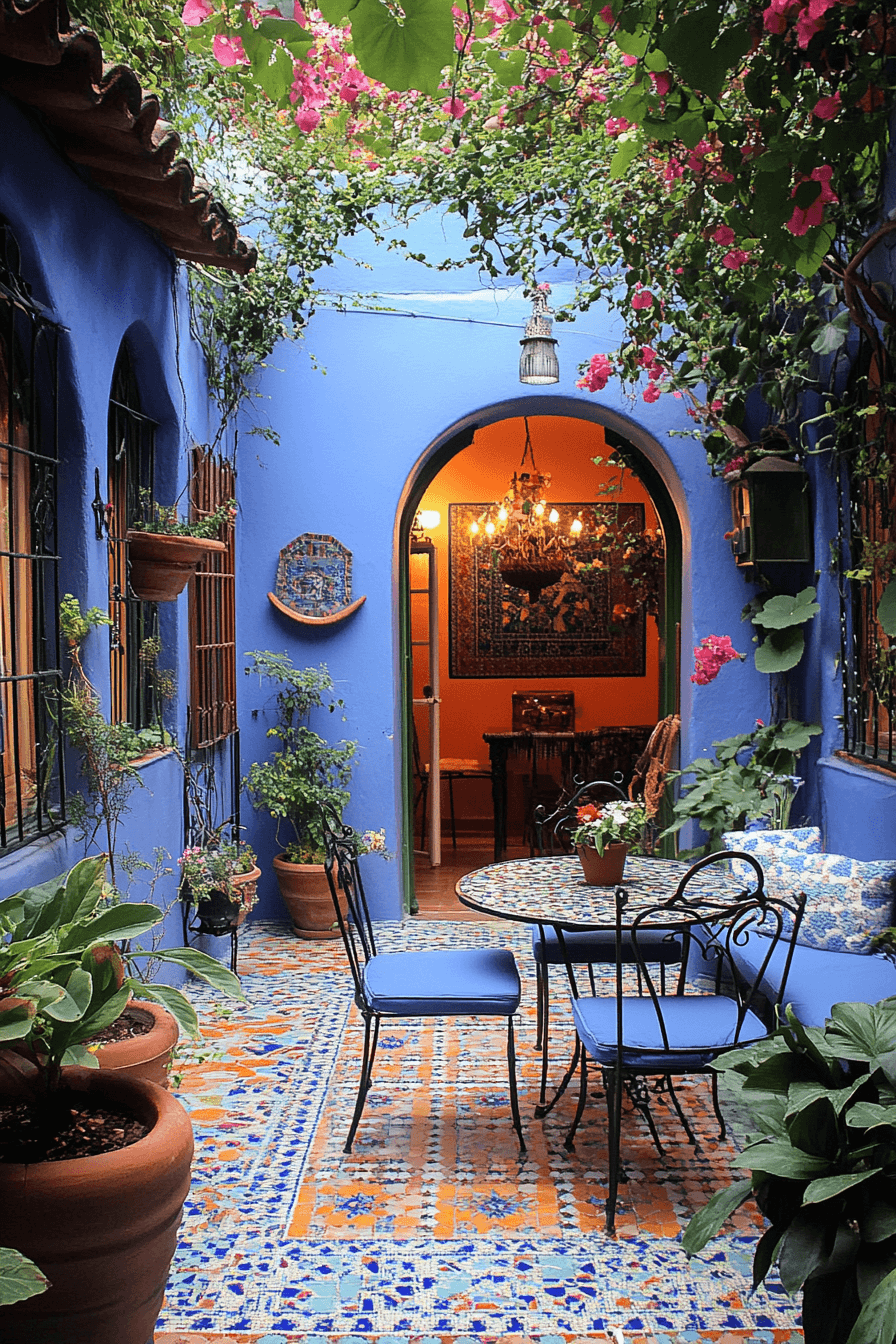 Warm Mediterranean touches elevate a tiny apartment patio ideas concept with color and charm. Terra cotta elements and decorative details create a sunlit, inviting feel. A small table setup adds function without overwhelming the area. Bright accents energize the space beautifully. The patio feels lively and welcoming. Bring Mediterranean warmth into your outdoor space and enjoy the vibe.