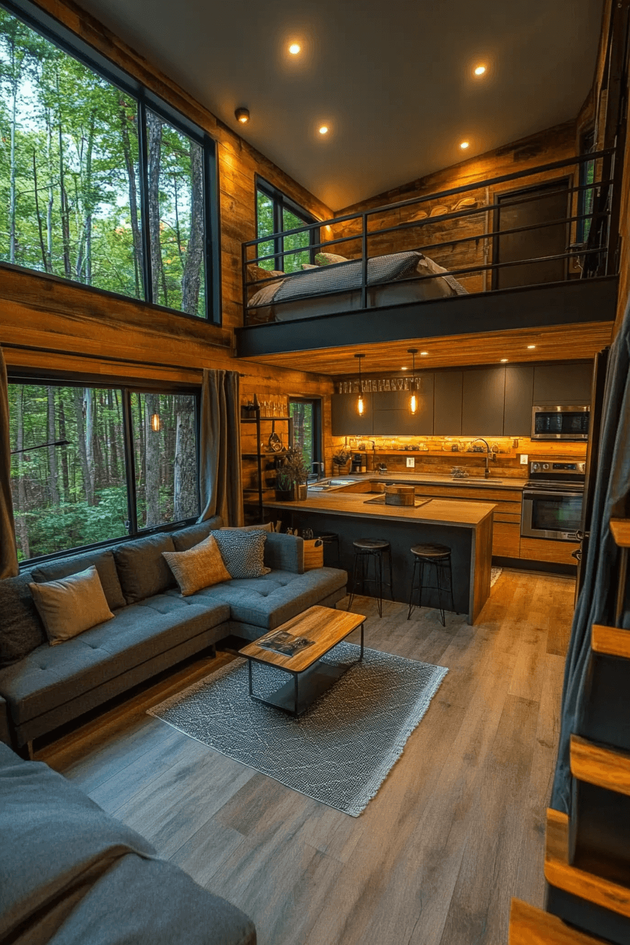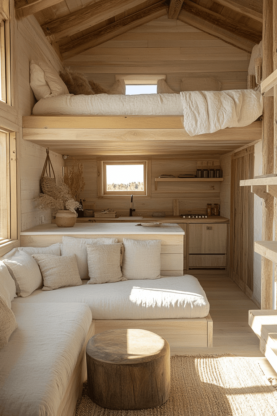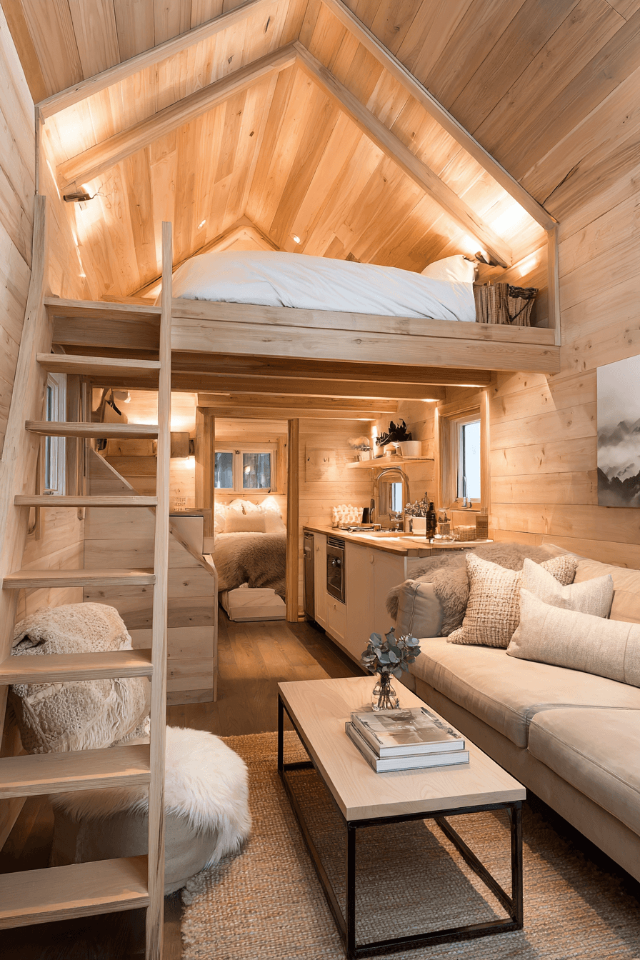 Lofted sleeping spaces maximize vertical design in tiny cabins interiors while creating a cozy upper retreat. Elevated beds free up room below for other uses. Soft lighting and simple finishes maintain comfort. Railings and skylights enhance safety and openness. The design feels efficient and inviting. Explore loft ideas that make the most of your space.