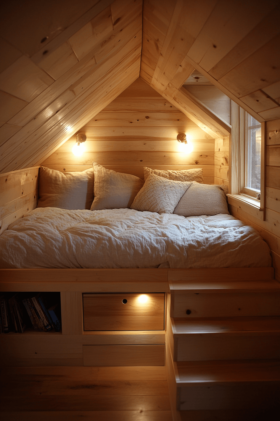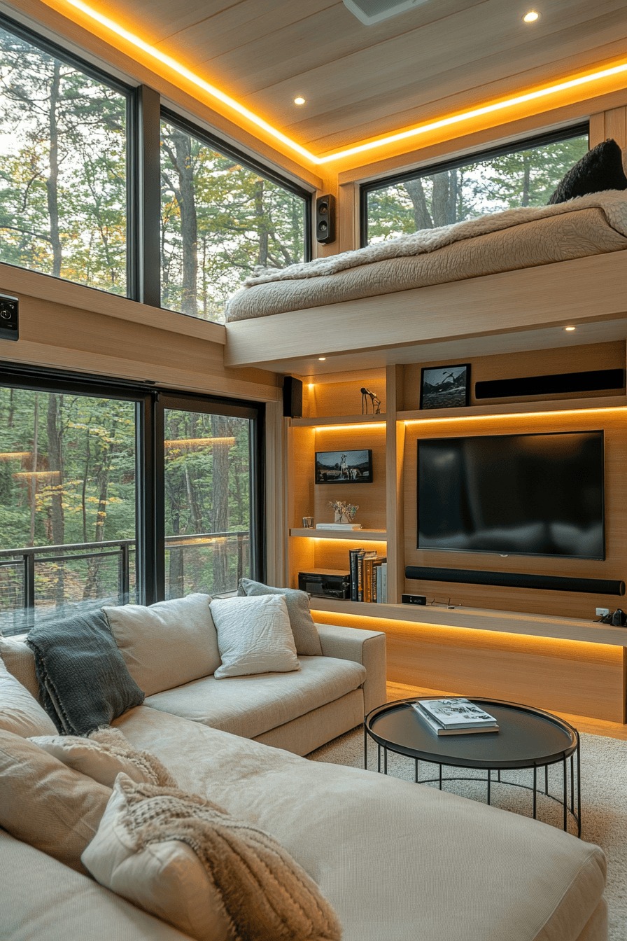 Elevating the bed instantly unlocks extra functionality in tiny cabins interiors while creating a cozy upper retreat. Space below can easily transform into a lounge, desk area, or compact dining zone. Soft ambient lighting and built-in storage make the loft feel practical yet inviting. Warm wood finishes and plush bedding enhance comfort and charm. Every detail works together to maximize limited square footage. Reimagine your cabin with loft ideas that expand both space and style.