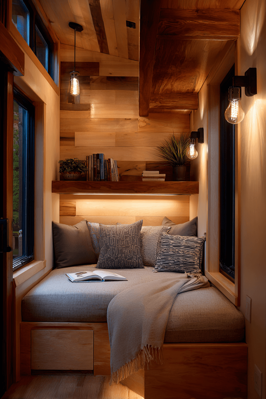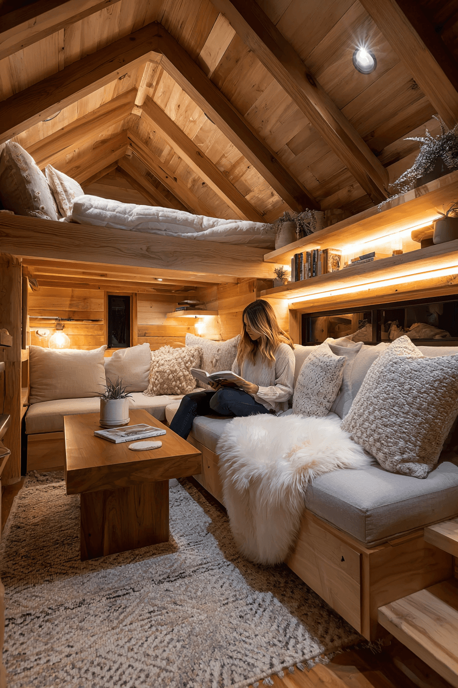 Cozy zones beneath lofts create functional and inviting areas within tiny cabins interiors. Soft seating and warm lighting turn unused space into a relaxing retreat. Built-in storage keeps everything organized and accessible. Layered textures add comfort and visual depth. The space feels both practical and welcoming. Turn under-loft areas into your favorite place to unwind.