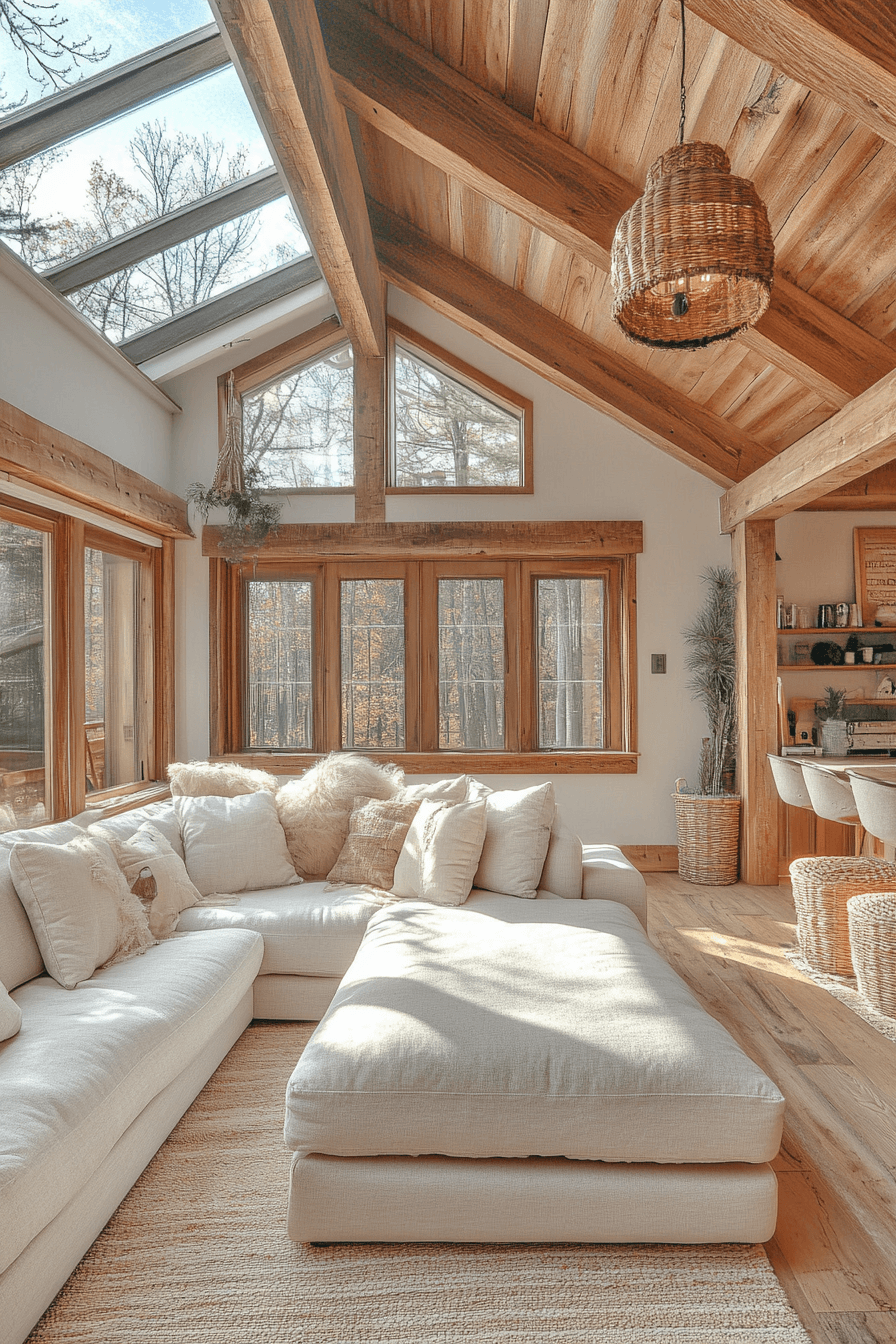 Vertical height transforms tiny cabins interiors by creating a sense of openness and visual interest. Exposed beams add rustic character while light finishes brighten the space. Skylights introduce natural light from above. Hanging fixtures draw attention upward. The cabin feels larger and more dynamic. Explore ceiling ideas that elevate your interior design.
