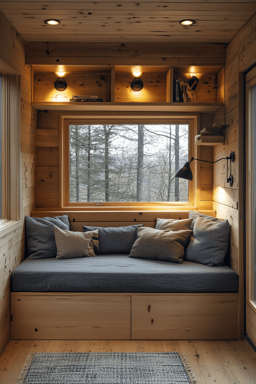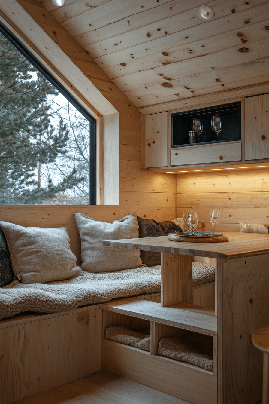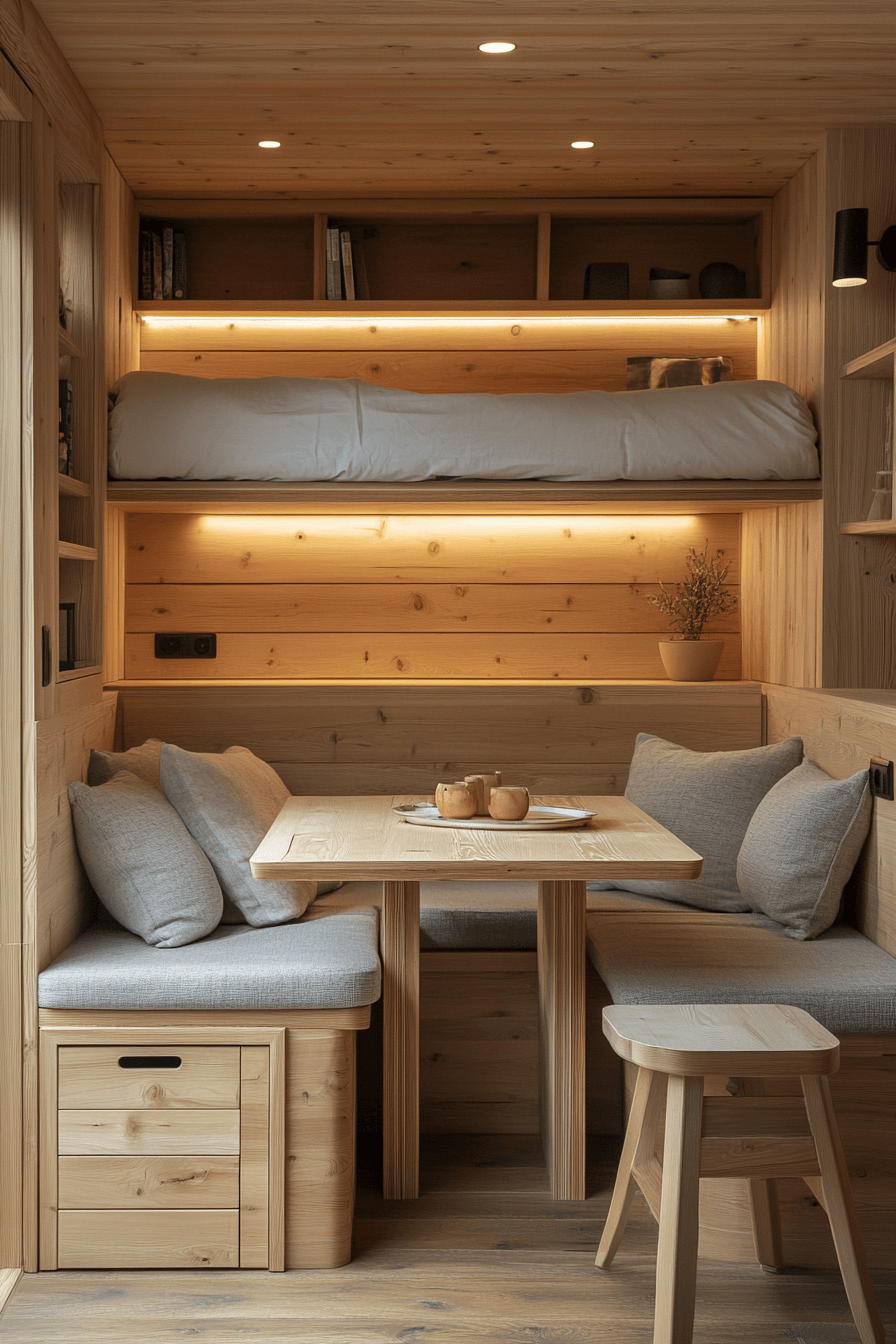 Integrated seating creates comfort and storage within tiny cabins interiors without taking up extra room. Built-in benches hide compartments for easy organization. These spaces double as seating for relaxing or dining. Cushions add softness and style. The design feels both functional and inviting. Upgrade your cabin with seating that works smarter.
