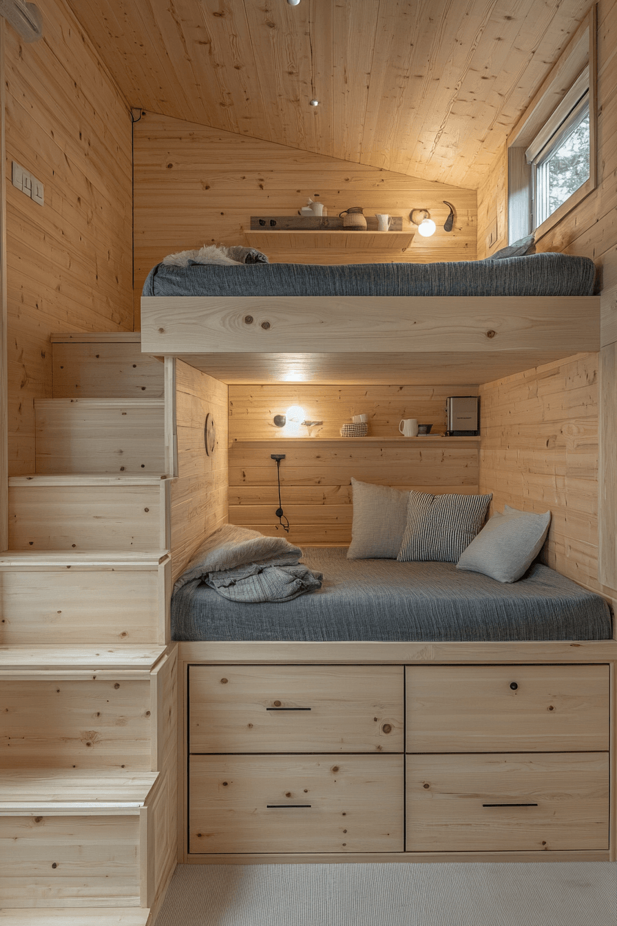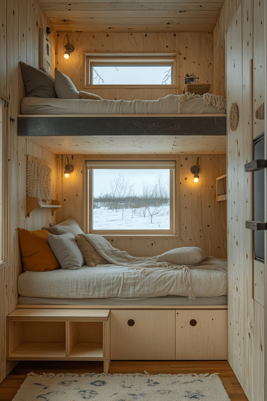 Built-in sleeping alcoves offer a cozy and space-saving feature that fits beautifully within tiny cabins interiors. Tucked into walls or framed with wood, these areas provide comfort and privacy. Integrated lighting and storage drawers make them even more functional. Soft bedding and cushions turn each nook into a relaxing hideaway. The design feels warm and thoughtfully planned. Discover sleeping nook ideas that add charm to small cabins.
