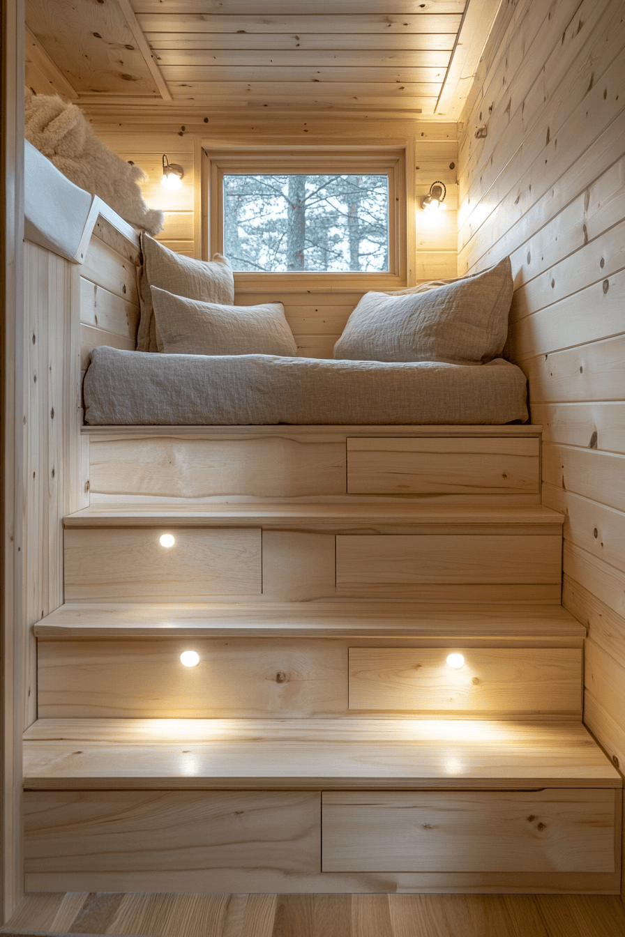 Multifunctional staircases enhance tiny cabins interiors by combining movement with storage solutions. Drawers and shelves built into steps add valuable space. Compact stair designs save room while maintaining function. Natural materials keep everything cohesive. Each step contributes to the overall design. Discover stair ideas that add both style and utility.