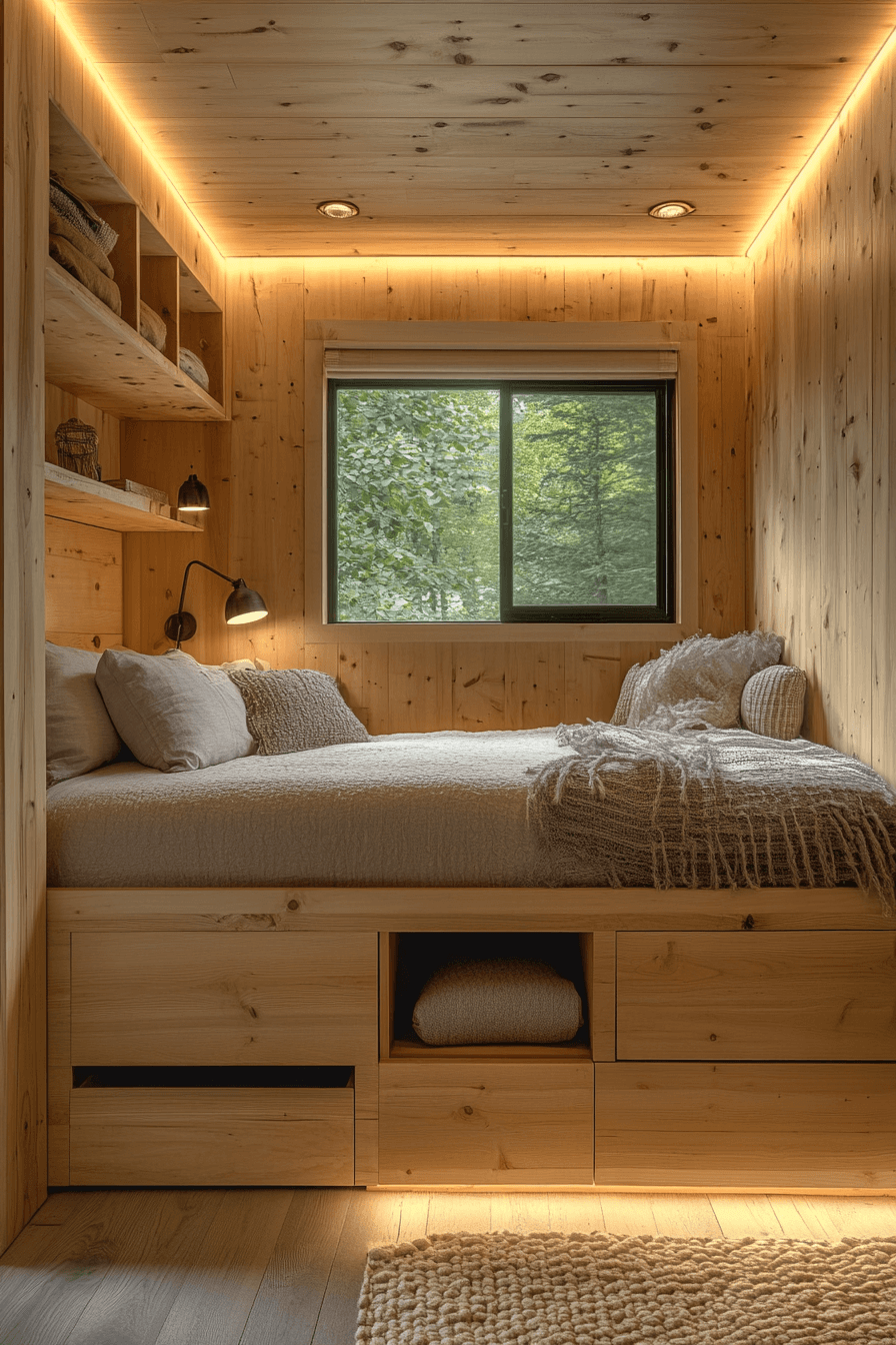Under-bed storage keeps tiny cabins interiors organized by using space that would otherwise go unused. Drawers and bins hold extra items neatly out of sight. Matching finishes maintain a cohesive look. Everyday living becomes more efficient. The space stays clutter-free. Discover storage ideas that make your cabin easier to manage.