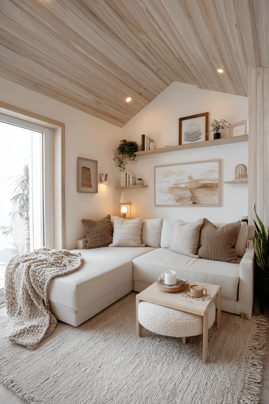 Neutral tones create a calming atmosphere in tiny cabins interiors while enhancing brightness and openness. Shades like soft beige, gray, and ivory reflect light beautifully. Natural wood accents add warmth and texture. Subtle contrasts prevent the design from feeling flat. The space feels balanced and inviting. Refresh your cabin with a timeless neutral palette.