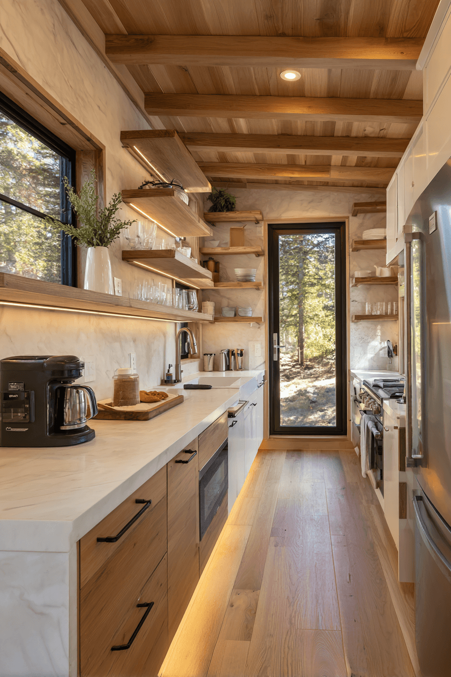 Smart kitchen planning makes tiny cabins interiors more functional while maintaining a welcoming atmosphere. Vertical storage and compact appliances keep everything within reach. Bright cabinetry and thoughtful lighting create an open feel. Efficient layouts make cooking and cleaning easier. The space becomes both practical and enjoyable. Discover kitchen designs that bring big function to small cabins.