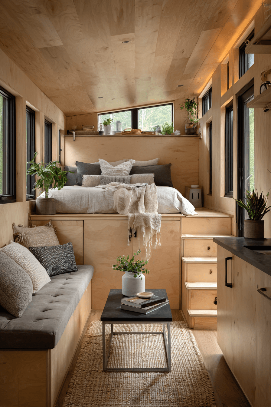 Elevated bed platforms bring structure and versatility into tiny cabins interiors by defining separate zones. Lifting the sleeping area creates space below for storage or seating. Cozy textures and warm lighting enhance comfort above. Simple railings keep the design open while ensuring safety. The layout feels intentional and organized. Maximize your cabin with elevated sleeping solutions that work smarter.
