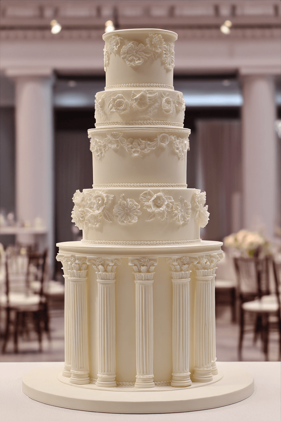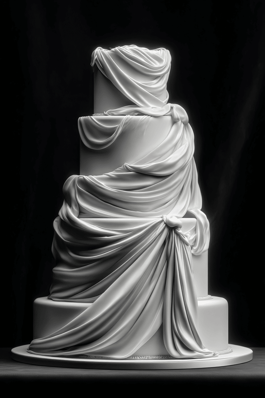 Draped detailing introduces softness into traditional wedding cakes ideas with flowing elements that mimic fabric-like movement. Gentle folds create depth and texture across each tier. Light enhances the layered effect beautifully. The design feels romantic and luxurious. Each detail adds visual interest. Explore draped styles that elevate cake design.