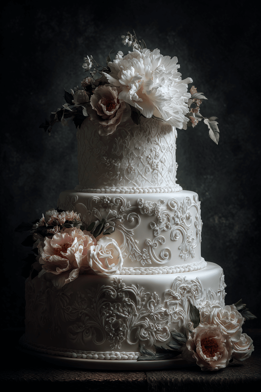Layered finishes add subtle dimension to traditional wedding cakes ideas with a mix of textures that feel refined and elegant. Smooth and detailed surfaces work together seamlessly. Light enhances the depth across each tier. The design remains clean while offering visual interest. Each element feels cohesive and balanced. Explore layered textures that elevate cake design.