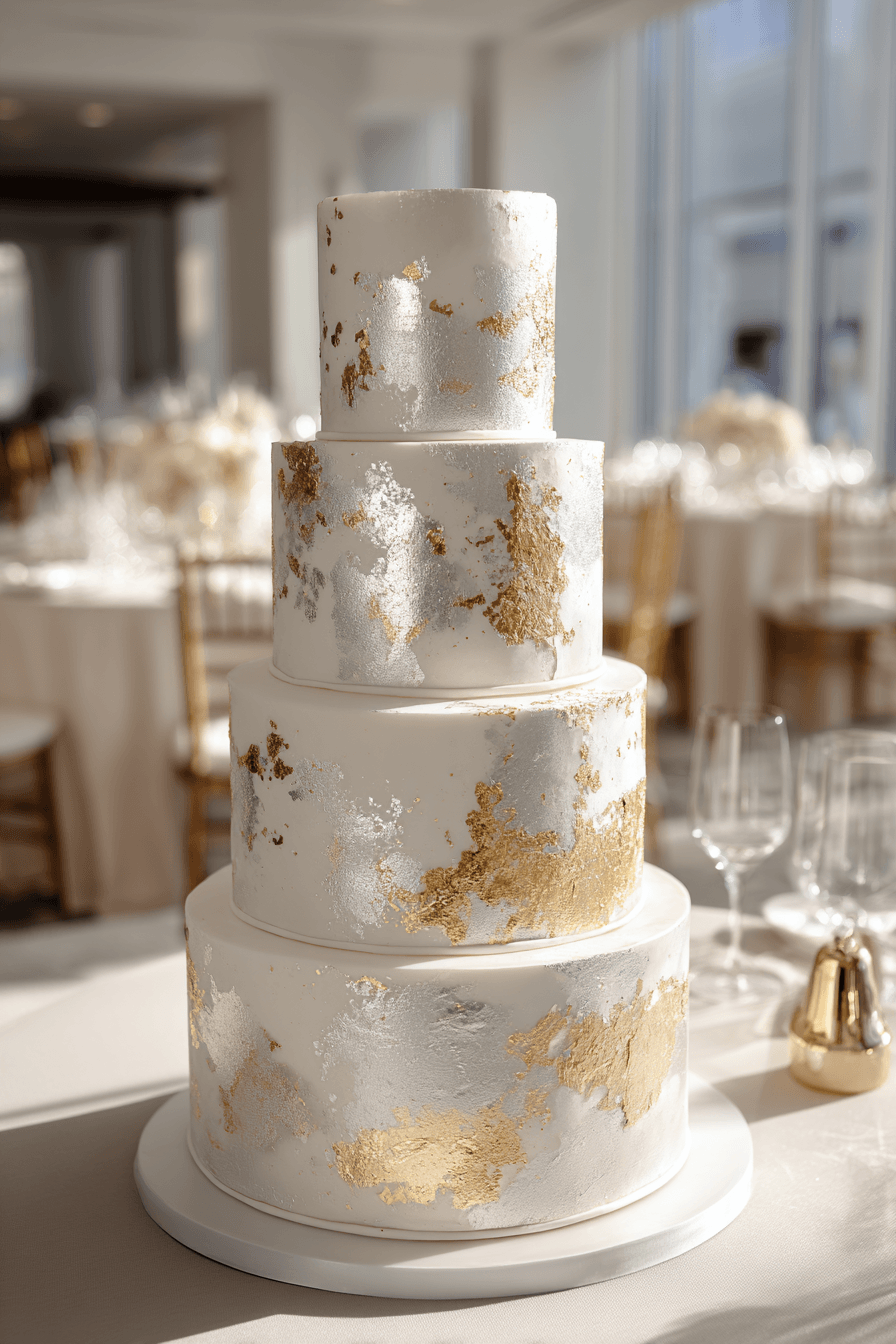 Metallic highlights bring a luxurious glow to traditional wedding cakes ideas with subtle shimmer and shine. Gold or silver details create contrast against soft icing tones. Light enhances the reflective surfaces beautifully. The design feels elevated yet timeless. Each tier gains added depth and sophistication. Explore metallic finishes that transform wedding cakes.