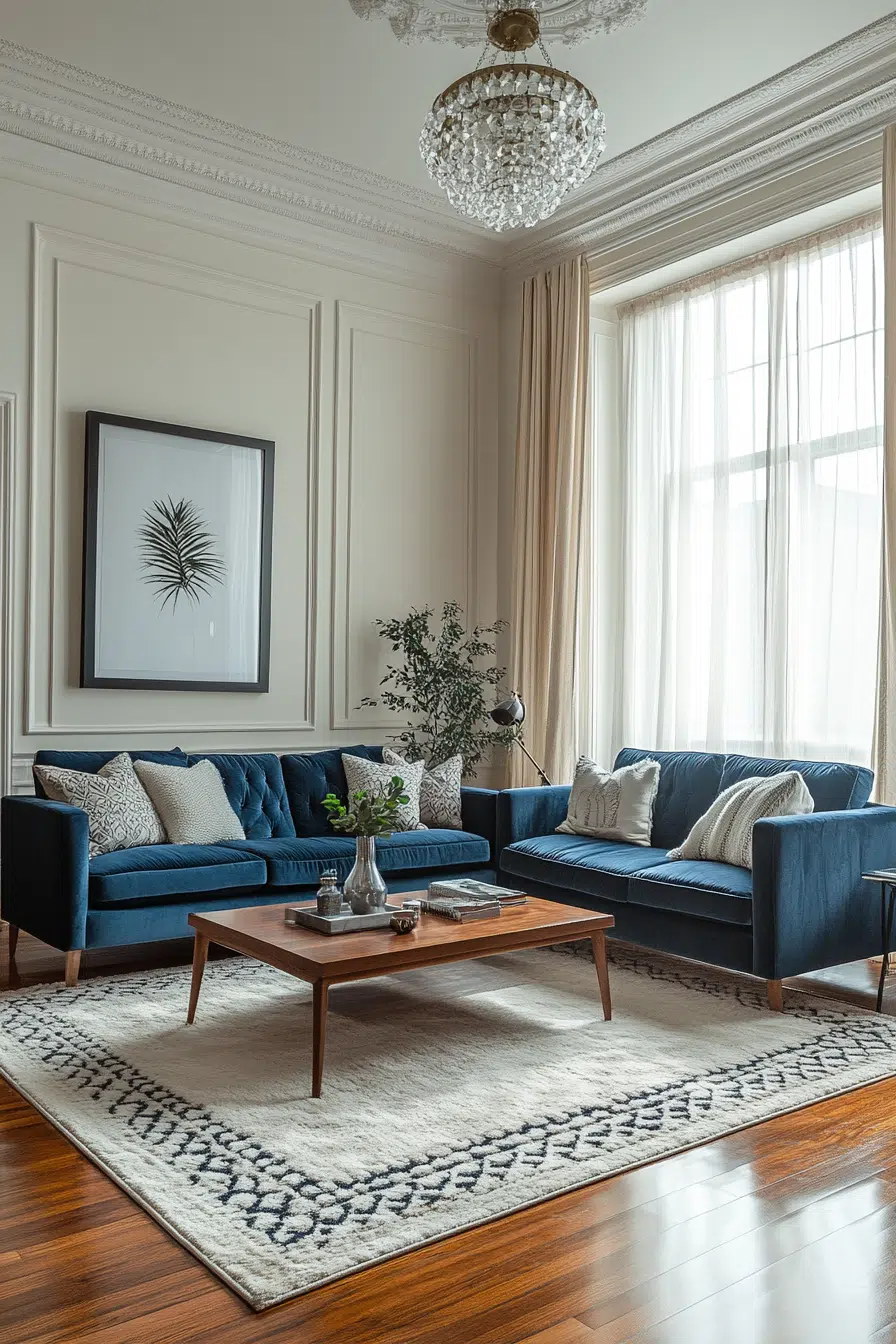 Recreate Hollywood Elegance in your vintage modern living room with luxurious 20th-century touches and modern aesthetics. Velvet sofas and ornate mirrors pair with a fresh color scheme for a cinematic feel. It’s perfect for a dramatic yet livable space.